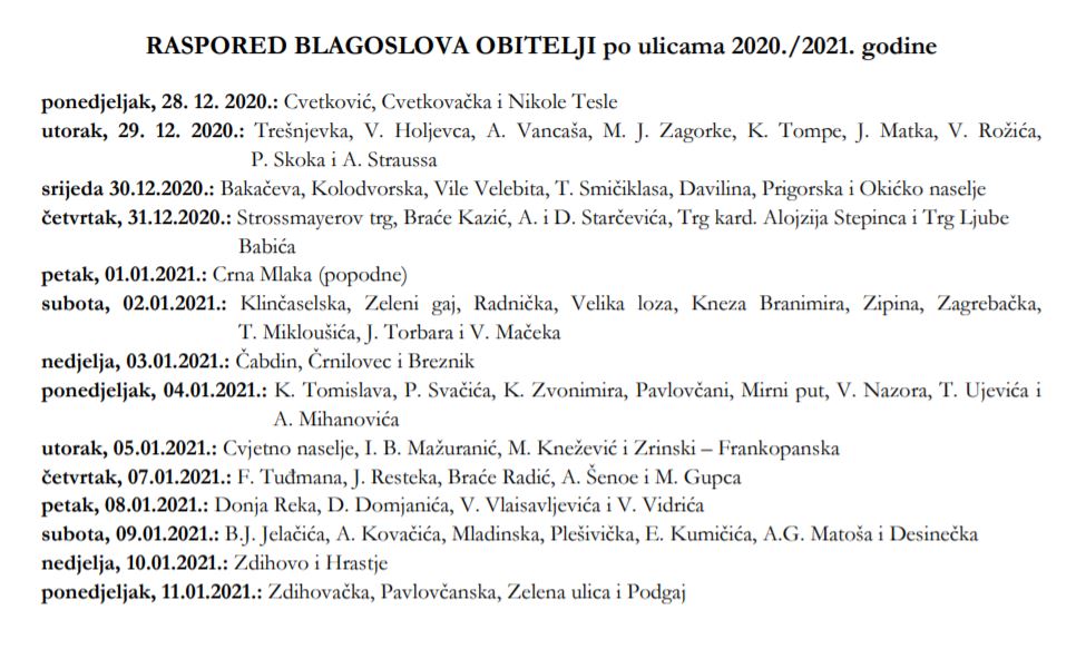 Jednako tako, ako netko smatra da svojim dolaskom ugrožavamo zdravstvenu sigurnost obitelji i ukućana, ne mora nas primiti niti želimo da se zbog toga osjećate manje vjernicima ili da nas primate u strahu „što će svećenik i ljudi reć“. Razumijevanje je kršćanska vrlina. U tom slučaju, Vašu obitelj možemo blagosloviti nekom drugom prilikom tijekom godine. Posjet svećenika možete dogovoriti pozivom na broj upravitelja župe 095/8529 133 ili na e mail adresu naše župe: zupni.ured.sv.nikole@zg.t-com.hr. Isto tako, molimo Vas da na vrijeme odgodite molitvu blagoslova u Vašem domu ako se netko razboli ili mu je određena nužna mjera samoizolacije te da kontaktirate na navedeni broj. Detaljni raspored blagoslova po ulicama i naseljima možete vidjeti na dnu ovog božićnog pisma.