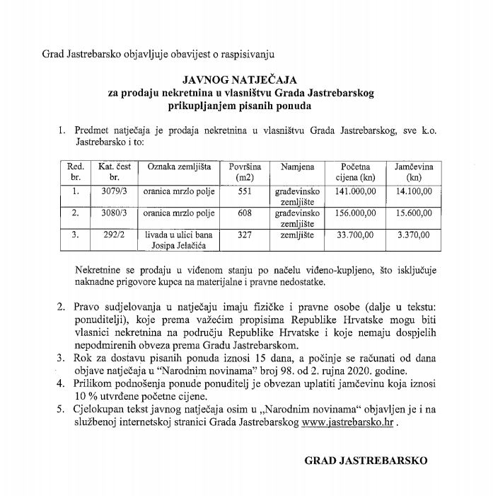 Rok za predaju pisanih ponuda je 17. rujna, a prilikom podnošenja ponude obavezna je uplata jamčevine u iznosu 10% od utvrđene početne cijene nekretnine. Pisana ponuda s podacima o ponuditelji i dokazu o uplaćenoj jamčevini dostavljaju se preporučeno poštom na adresu gradske uprave na Strossmayerovom trgu 13 ili osobno u pisarnici grada Jastrebarskog.
