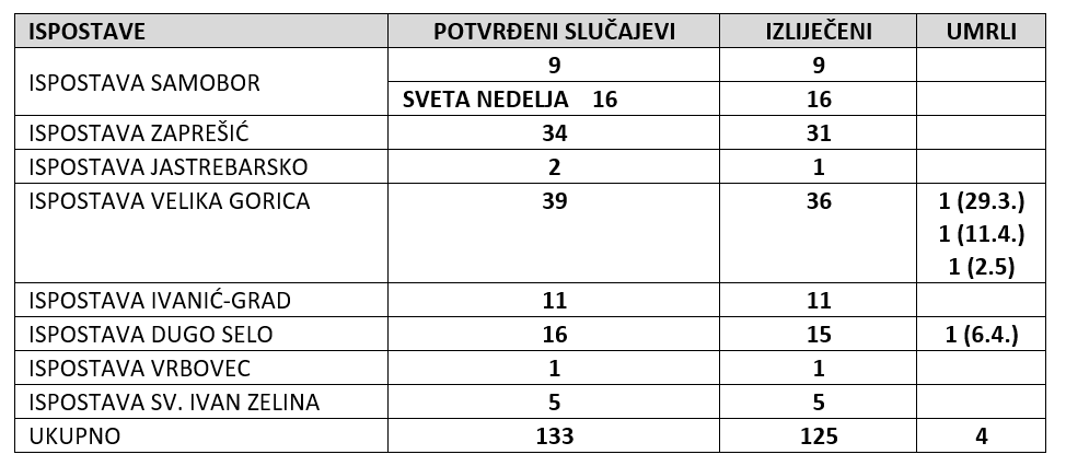 Naime, prema podacima Zavoda za javno zdravstvo Zagrebačke županije na području županije danas do 11 sati evidentirane su 133 osobe s potvrđenom bolešću uzrokovanom koronavirusom. Radi se o dvije osobe više nego jučer, od toga jedna dolazi s područja Ispostave Jastrebarsko, a druga s područja Ispostave Zaprešić. Uz ta dva nova slučaja, aktivna su još dva, oba na zaprešićkom području.