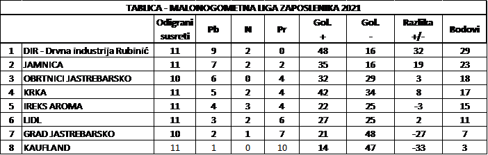 Nakon odgode subotnjeg kola zbog lošeg vremena, ovog su tjedna u jaskanskoj malonogometnoj Ligi zaposlenika odigrana dva kola, a do kraja lige ostala su još tri i ukoliko neće biti većih iznenađenja, ekipa Drvne industrije Rubinić preuzet će titulu tvrtke u kojoj se igra najbolji nogomet u Jaski.