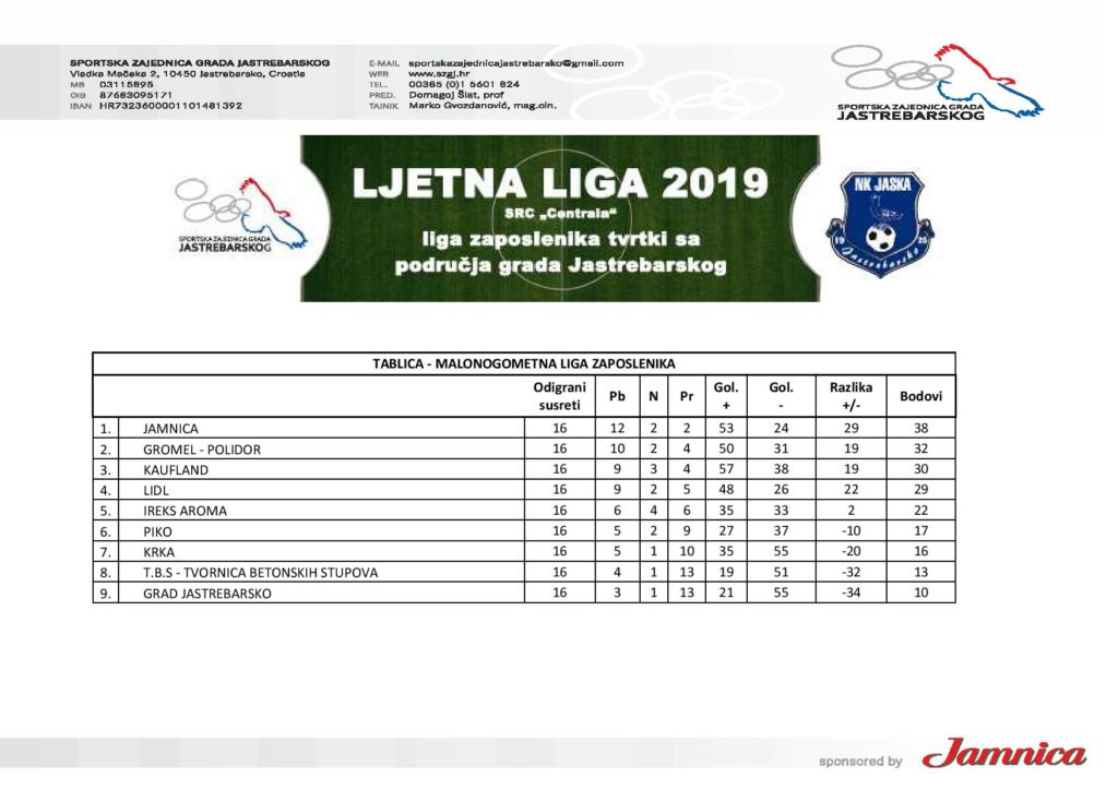 Nakon odigranih 18 kola tijekom srpnja i kolovoza, te mnogo zanimljivih utakmica, u konkurenciji devet momčadi, ekipa tvrtke Jamnica osvojila je premijerno izdanje Lige te će nositi laskavu titulu tvrtke u kojoj se igra najbolji nogomet na području našeg grada.