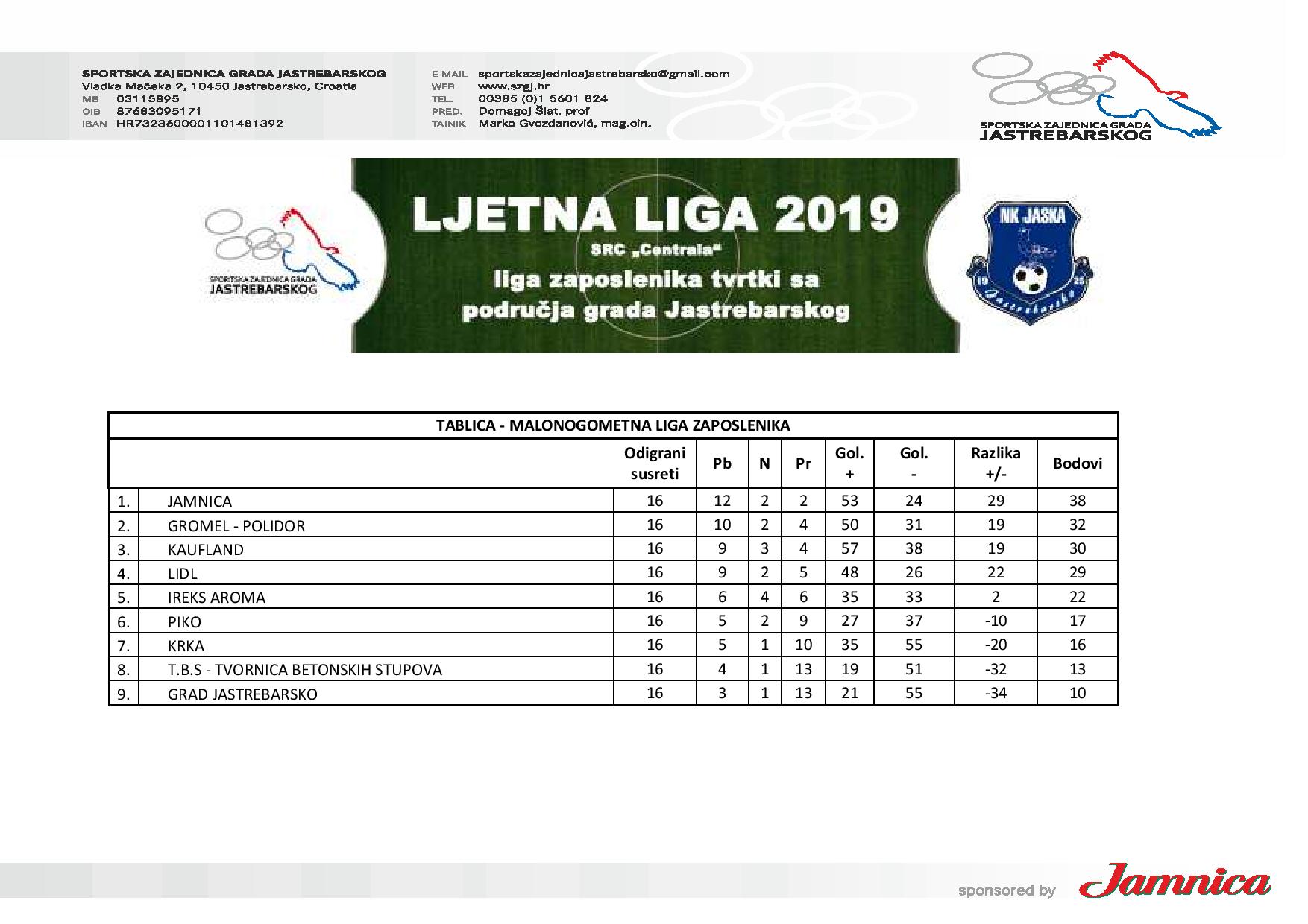 Nakon odigranih 18 kola tijekom srpnja i kolovoza, te mnogo zanimljivih utakmica, u konkurenciji devet momčadi, ekipa tvrtke Jamnica osvojila je premijerno izdanje Lige te će nositi laskavu titulu tvrtke u kojoj se igra najbolji nogomet na području našeg grada.