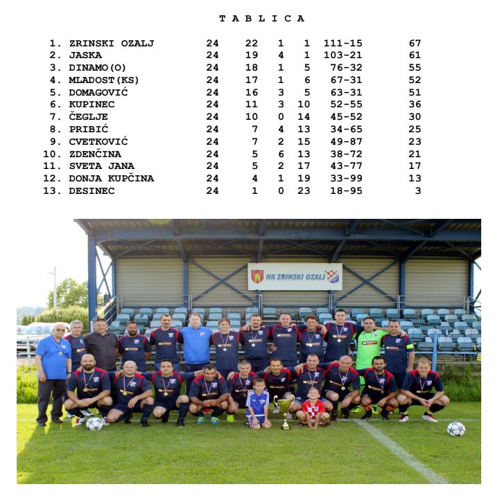 Završila je i veteranska liga, a prvaci su igrači Zrinskog iz Ozlja. U 24 utakmice oni su osvojili 67 bodova, veterani Jaske su drugi sa 61 bodom, a treći Dinamo Okić s 55 bodova.