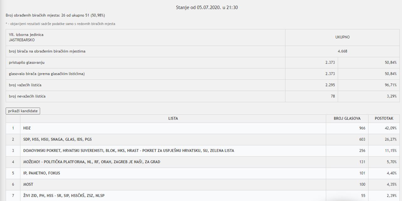 21:45 Nakon što je u Jastrebarskom obrađenih biračkih mjesta 33 od ukupno 51 (64,71%), situacija je sljedeća: