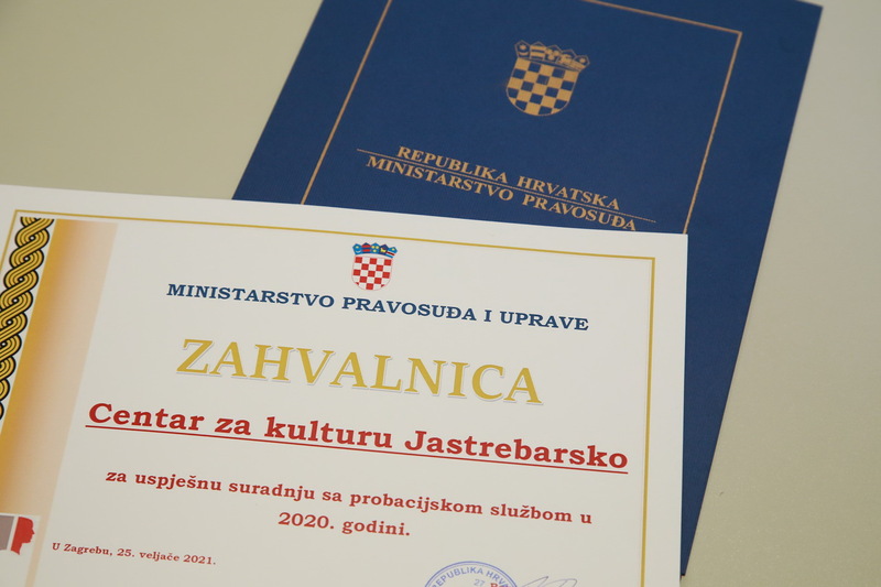 Centar za kulturu Jastrebarsko dobitnik je ovogodišnje zahvale Ministarstva pravosuđa i uprave, za uspješnu suradnju s probacijskom službom u 2020. godini.