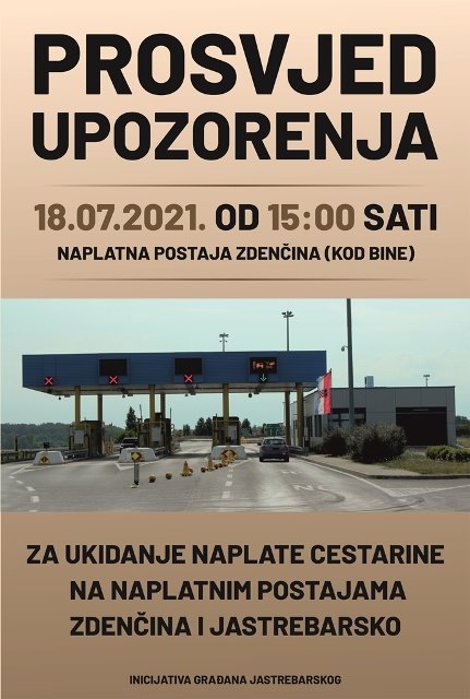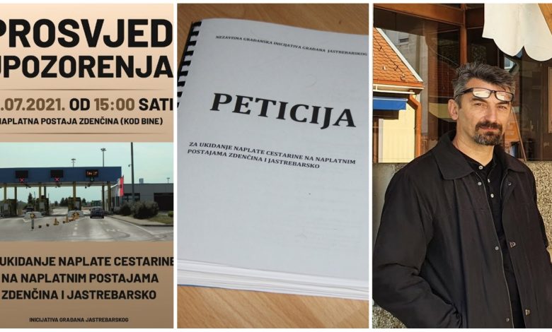 Nakon peticije, Inicijativa građana Jastrebarskog u nedjelju poslijepodne, od 15 sati, na naplatnim kućicama u Zdenčini organizira i javni prosvjed za ukidanje naplate cestarine na auto cesti od Zagreba do Zdenčine, odnosno do Jastrebarskog.