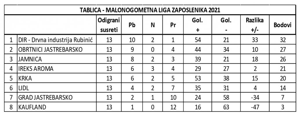 Ekipa Drvne industrije Rubinić kolo prije kraja Ljetne lige zaposlenika Grada Jastrebarskog osigurala je prvo mjesto i laskavu titulu koju ova liga sa sobom nosi. Jučerašnjim derbijem između Jamnice i DIR-a odlučen je prvak ovogodišnje Lige zaposlenika jer je u čvrstoj utakmici spretnija bila ekipa DIR-a i pobjedom 3:1 stigla do 32 boda te je pobjegla na nedostižnih 5 bodova i tako matematički, kolo prije kraja, osigurala 1. mjesto u Ligi.
